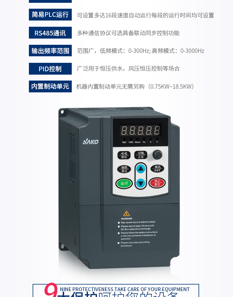 0.75KW~15kW各規(guī)格變頻器內(nèi)置制動單元,如需快速停車,可直接連接制動電阻;