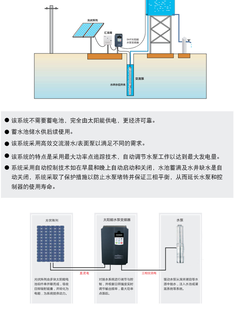 應用行業(yè):廣泛應用于陽光充足、市電短缺的地區(qū),可以解決農場灌溉、畜牧養(yǎng)殖、生產生活的用水問題。