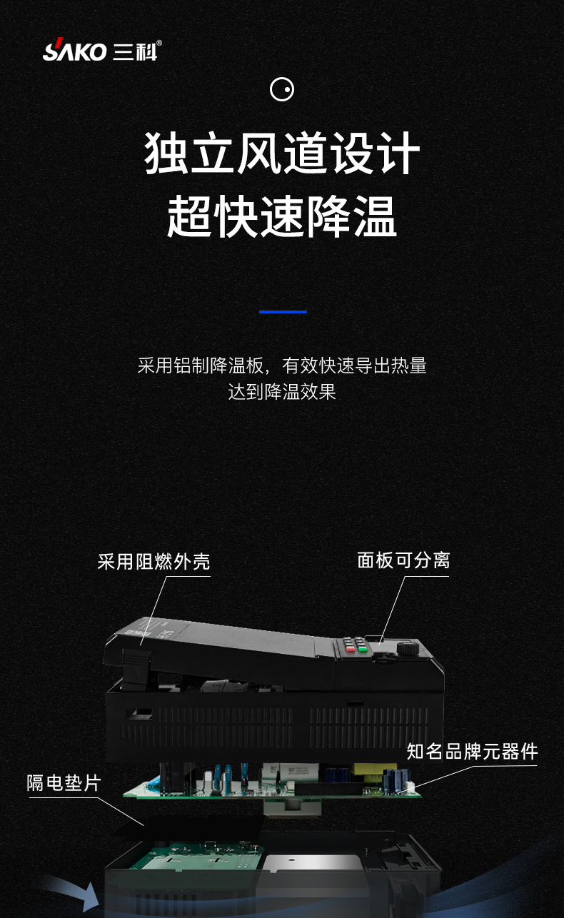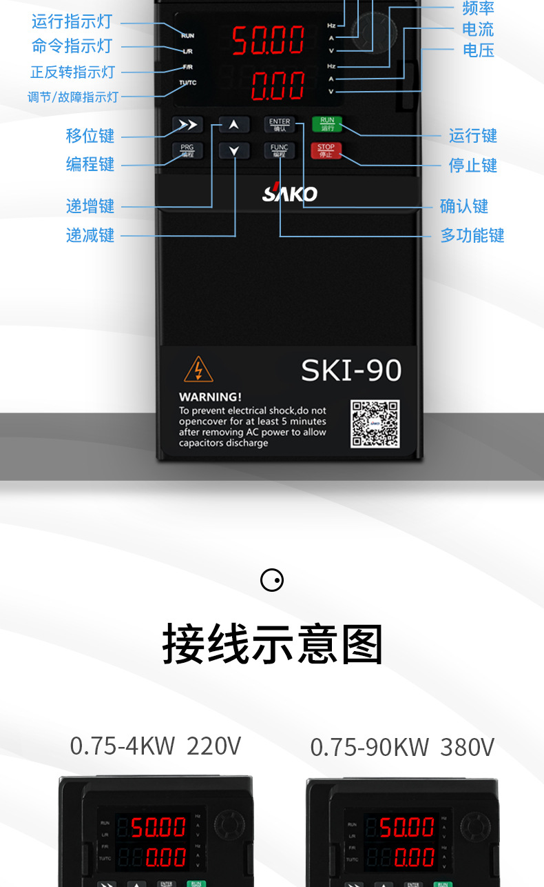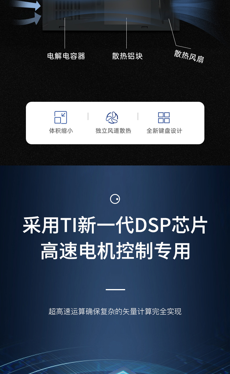 模塊機(jī),體積小,功能強(qiáng)大,市面上超過98%的變頻器都可替換使用,纖細(xì)外觀,內(nèi)部全新升級,設(shè)計更緊湊,空間更節(jié)省更節(jié)約安裝空間,增加機(jī)柜里變頻器安裝數(shù)量,有效降低成本,雙排LED超清顯示,面板可外接延長。上下雙排都可顯示頻率,電壓,電流。