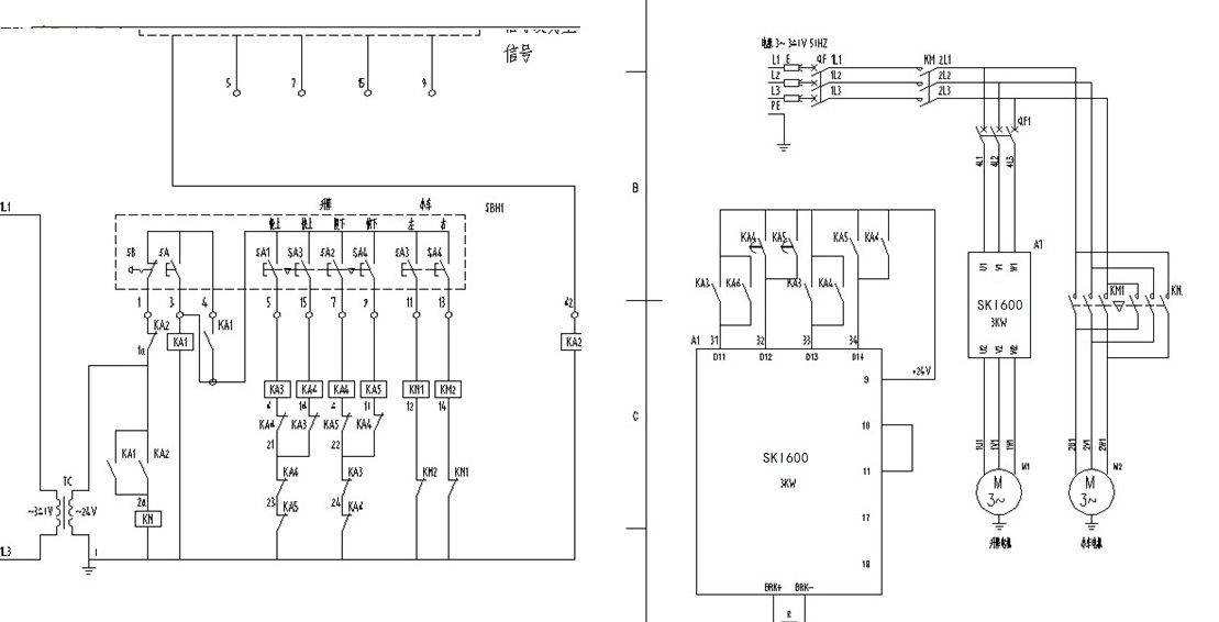 因此我們?cè)诒痉桨钢杏?jì)劃加兩個(gè)延時(shí)觸頭來穩(wěn)定保障抱閘的有效性。vfd的宏選擇交變宏。但考慮到葫蘆本身的抱閘較緊,以及在低速運(yùn)行頻率較低情況下會(huì)無法打開抱閘。這個(gè)問題我們可以通過調(diào)試SKI600提升頻率就可以快速解決。