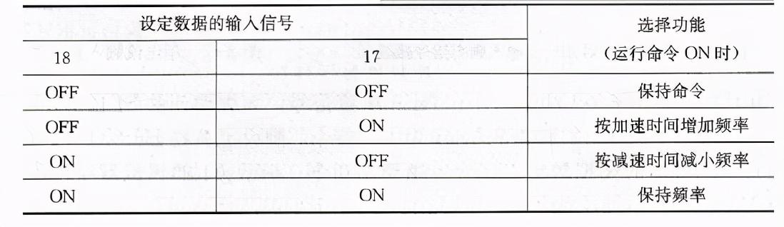 RP的應(yīng)用有其局限。它是因?yàn)镽P鍵入的是0~10V的電壓數(shù)據(jù)信號,而電壓數(shù)據(jù)信號伴隨著傳送間距的增加遭受的影響擴(kuò)大。假如安裝現(xiàn)場與變頻器間距較遠(yuǎn),則沒法確保數(shù)據(jù)信號傳送的精確性。在這類狀況下,頻率數(shù)據(jù)信號能夠那樣來設(shè)置:在鍵入接線端子X1~X9中,隨意特定某2個(gè)接線端子,并設(shè)置其數(shù)據(jù)信息為“17”(增指令)和“18”(減指令),那樣在運(yùn)作數(shù)據(jù)信號(ON)時(shí),可用外界觸點(diǎn)鍵入數(shù)據(jù)信號增/減設(shè)置頻率。接線端子的作用見表2-4,這時(shí)的接線方法如圖2-18(b)所顯示。