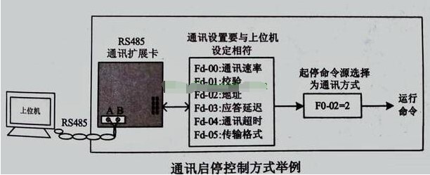 在VFD多功能擴(kuò)展口上,插入相應(yīng)的通信接口卡,選擇控制命令源作為通信模式(F0-02=2),這樣就可以通過通信模式控制VFD的啟動(dòng)和停止。通信相關(guān)功能代碼的設(shè)置如下圖所示。