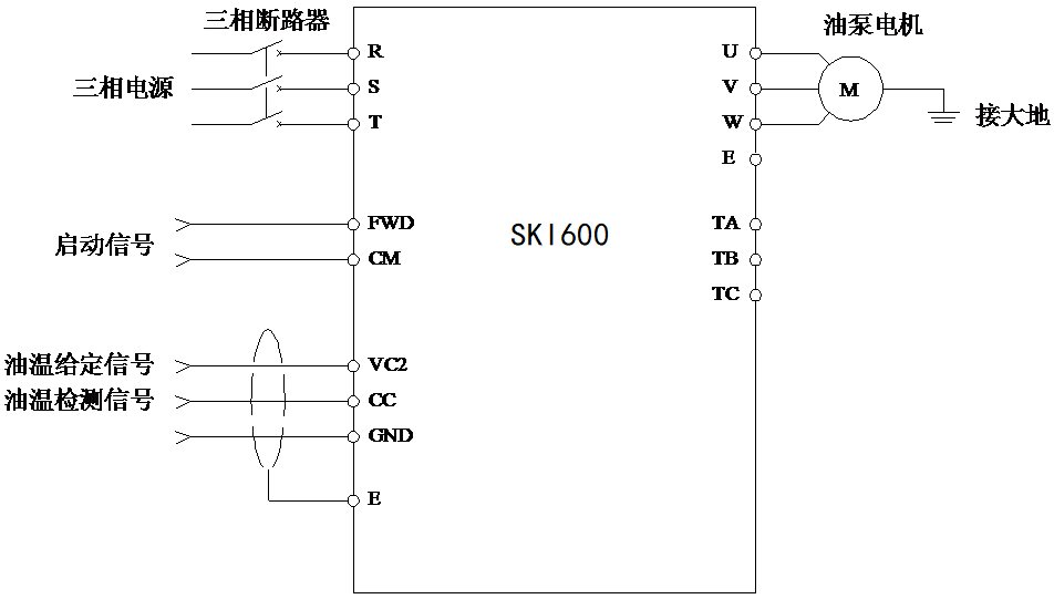 根據(jù)窯爐風(fēng)機(jī)系統(tǒng)控制的要求,采用三科SKI600通用重載變頻器來(lái)實(shí)現(xiàn)系統(tǒng)的全自動(dòng)溫度控制。即由溫度傳感器采集窯爐的當(dāng)前溫度,并通過(guò)模擬量通道反饋給變頻器,然后與設(shè)定的溫度值做比較,再由變頻器的PID控制器改變輸出頻率以調(diào)節(jié)風(fēng)機(jī)的轉(zhuǎn)速,進(jìn)而控制系統(tǒng)風(fēng)量,以保證系統(tǒng)的溫度控制精度及響應(yīng)性。其系統(tǒng)原理圖如下圖2所示: