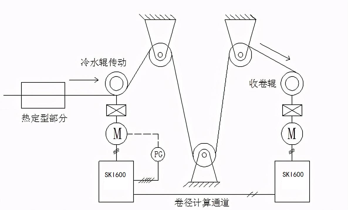 熱定型機卷取機前級為冷水輥,采用三分支SKI80高性能矢量控制變頻器和恒速控制。電機配有編碼器,編碼器利用冷水輥驅(qū)動器的速度反饋進行閉環(huán)控制。由卷繞控制的織物線速度由冷水輥變頻器的模擬輸出端口提供。卷筒空時直徑約200mm,滿時約1400mm,纏繞直徑變化7倍以上。在整個卷繞過程中,隨著卷繞直徑的增加,需要向卷繞電機提供更多的扭矩。卷筒采用三分支SKI600通用重型專用變頻器,中間安裝張力檢測輥作為斷線信號。