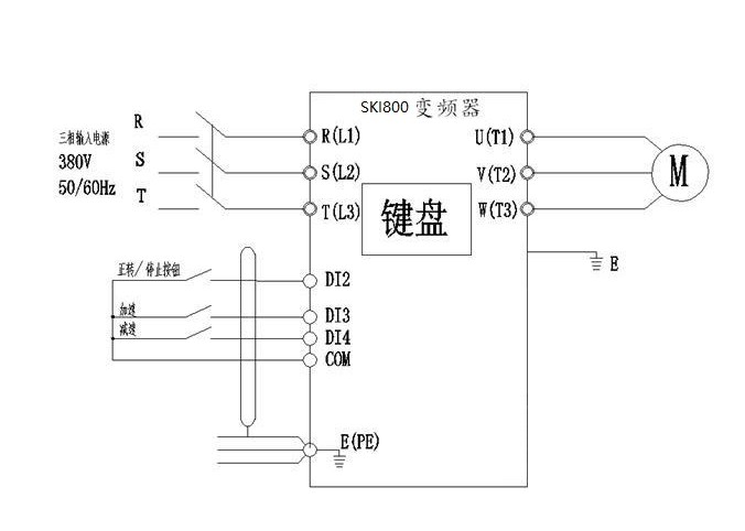 根據(jù)牽引電機(jī)工作原理,利用紅外線開(kāi)關(guān)控制牽引電機(jī)速度,紅外開(kāi)關(guān)通牽引減速,反之加速;根據(jù)工況,采用普傳科技SKI800變頻器控制牽引電機(jī),變頻器采用端子臺(tái)控制、頻率源主設(shè)為鍵盤(pán)電位器給定,頻率源敷設(shè)為鍵盤(pán)設(shè)定頻率UP/DOWN可修改,掉電不記憶;頻率源疊加選擇為個(gè)位:主輔運(yùn)算結(jié)果,十位:主+輔;紅外開(kāi)關(guān)常閉接DI3和COM,常開(kāi)接DI4和COM;原理圖如下: