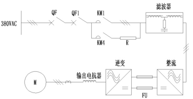 本次的計(jì)劃,主回路主要由用戶開關(guān)QF,變頻器輸入主斷路器QF1,緩沖接觸器KM4,主回路接觸器KM1,LCL濾波器,整流單元,逆變單元以及輸出電抗器幾局部組成。