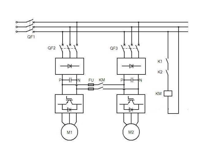 3.在有些場(chǎng)合,根據(jù)工藝特點(diǎn)使用VFD共用母線的方案,這種方案及解決了VFD過壓的問題,同時(shí),將工作過程中產(chǎn)生的能量回饋到直流母線再利用,節(jié)約能源。