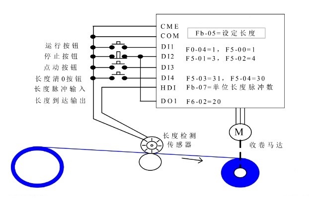 當(dāng)通過(guò)DI(DI功能選30)端采集長(zhǎng)度脈沖,其中終端采樣的脈沖數(shù)除以每米的脈沖數(shù)Fb-07,可以計(jì)算出實(shí)際長(zhǎng)度Fb-06。而當(dāng)實(shí)際長(zhǎng)度大于設(shè)定長(zhǎng)度Fb-05時(shí),多功能數(shù)字開(kāi)關(guān)輸出“已達(dá)到長(zhǎng)度”O(jiān)N信號(hào)。在定長(zhǎng)控制過(guò)程中,可以通過(guò)多功能DI端子(DI功能選擇為31)重新設(shè)定長(zhǎng)度。具體設(shè)置如下圖所示。