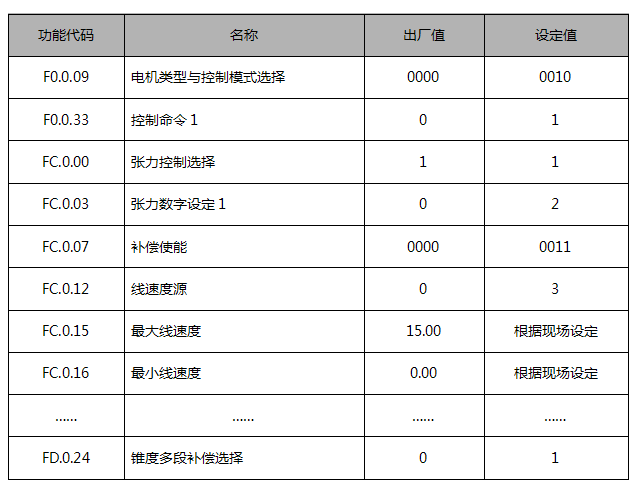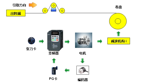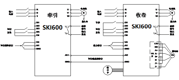 收卷變頻器采用閉環(huán)矢量模式,通過(guò)模擬電位器給定張力(收卷模擬輸入端AI1),線(xiàn)速度由牽引AO1模擬輸出端接入收卷AI2(4~20mA)。