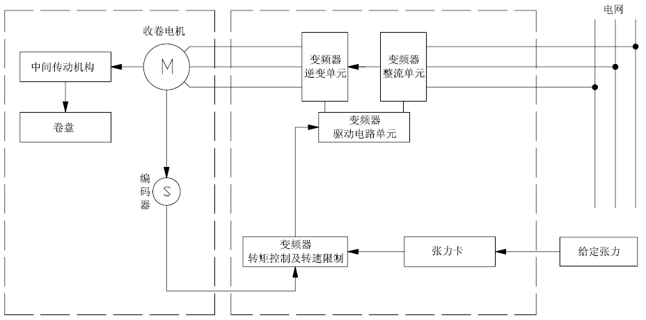 如下圖所示,收卷的恒張力控制,是按照工藝將系統(tǒng)收卷所需的張力及空、滿(mǎn)盤(pán)卷徑設(shè)置到張力卡,張力卡根據(jù)運(yùn)行線(xiàn)速度,計(jì)算出當(dāng)前卷徑,進(jìn)而得到收卷所需的轉(zhuǎn)矩并將其給到后再進(jìn)行轉(zhuǎn)矩控制。在收卷過(guò)程中,系統(tǒng)可自動(dòng)實(shí)時(shí)計(jì)算當(dāng)前的卷徑,以保證收卷張力的恒定。同時(shí)系統(tǒng)張力錐度的設(shè)置可使材料較好的卷曲成型。