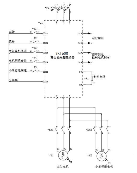 1.現(xiàn)場使用一臺三科生產(chǎn)的SKI600系列產(chǎn)品,用于控制兩臺電機