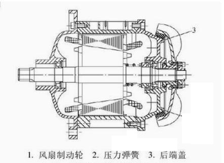 錐形轉(zhuǎn)子電動機定子內(nèi)腔和轉(zhuǎn)子外形都成錐形,其錐形制動環(huán)鑲嵌于風扇制動輪上,靜制動環(huán)鑲在后端蓋上,定子通電后,產(chǎn)生旋轉(zhuǎn)磁場,同時產(chǎn)生軸向磁拉力,使轉(zhuǎn)子軸向移動并壓縮彈簧,使風扇制動輪上的錐形環(huán)與靜制動環(huán)離開,轉(zhuǎn)子開始轉(zhuǎn)動,定子斷電后,軸向磁拉力消失,轉(zhuǎn)子在彈簧的作用下,連同風扇制動輪一起復位,使動靜制動環(huán)接觸,產(chǎn)生摩擦力矩,迫使電動機立即停轉(zhuǎn)。