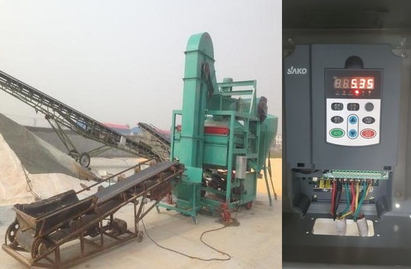 用工頻直接起動,電機能以最快速度到達工頻,篩體不容易產(chǎn)生機械碰撞甚至跳出軌道的情況。變頻器起動要想達到接近直接起動的效果,需要加速時間很短,這時起動電流會增加,因此,變頻器選型時要注意,需要加大兩檔選型,這樣可以避免起動過程中出現(xiàn)過電流報警的現(xiàn)象,同時,也可以保證設(shè)備安全穩(wěn)定運行。根據(jù)設(shè)備的使用情況,我們?yōu)槊颗_設(shè)備配套使用了一臺SKI600變頻器。