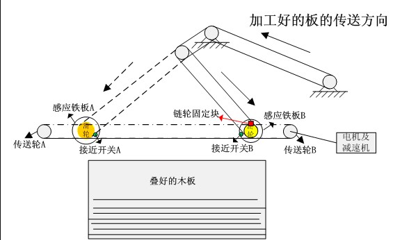 1.電機(jī)通過皮帶與減速器連接,減速器的輸出通過鏈輪與傳動輪A、B連接,鏈輪與皮帶輪固定。鏈輪移動時(shí),滑輪左右滑動,將傳送帶上的木板折疊起來;