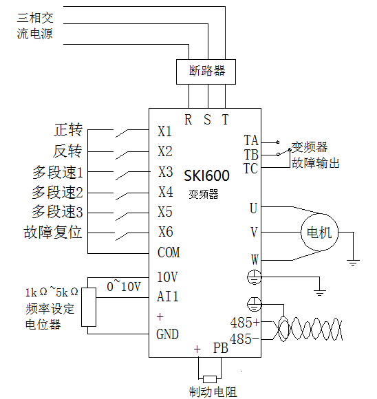 該現(xiàn)場(chǎng)采用易能PLC、SKI600-VFD和SK-MD204觸摸屏。PLC控制系統(tǒng)與人機(jī)界面之間采用標(biāo)準(zhǔn)的modbus通訊協(xié)議,準(zhǔn)確讀取變頻器的狀態(tài)信息。控制系統(tǒng)與變頻器之間采用多段速的控制方式,方便客戶準(zhǔn)確選擇不同的線體速度。
